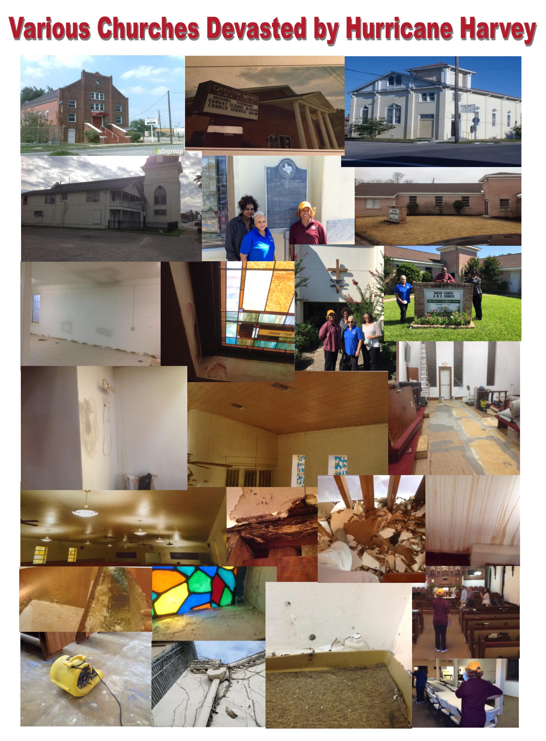 Thirty-three churches sustained damages during Hurricane Harvey. Two churches, Carroll Chapel AME Church in Willis and Bethlehem AME Church on the Old Ocean Circuit were a total loss. Three churches were forced out of their sanctuaries after the storm including Green Chapel AME Church in Houston, Jones Chapel AME Church in Houston, and Greater Ward AME Church in Houston. All three churches were back in their sanctuaries by Easter.
